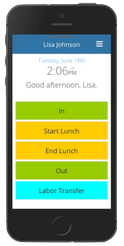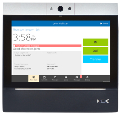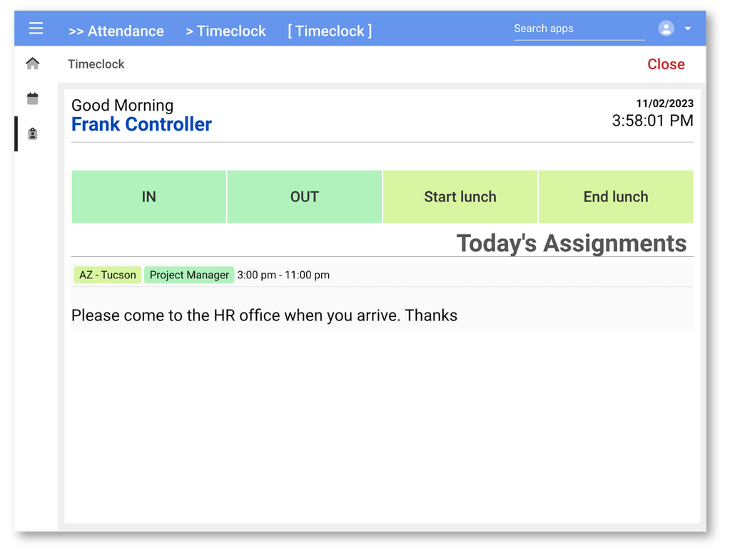 Timeclock. The timeclock app greets each worker when punching IN/OUT and for breaks. Today’s assignment and schedules can be displayed, along with any special shift instructions.