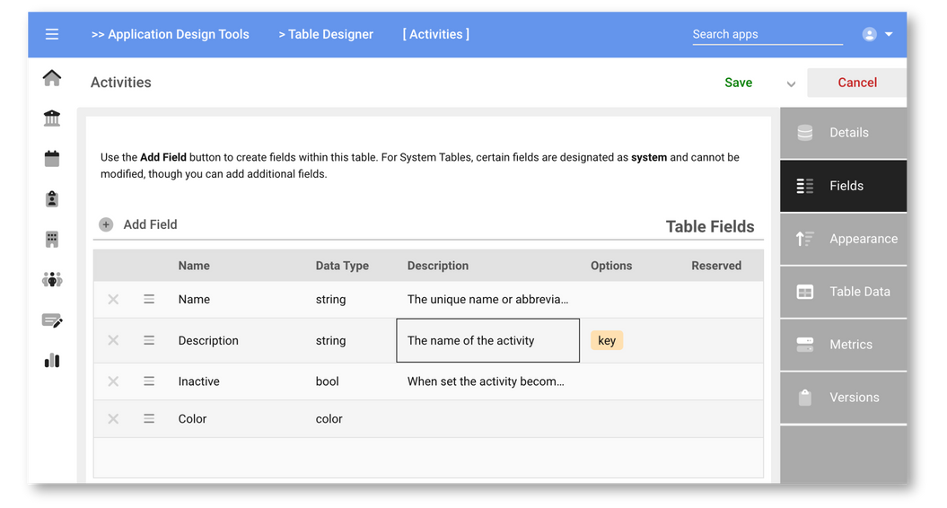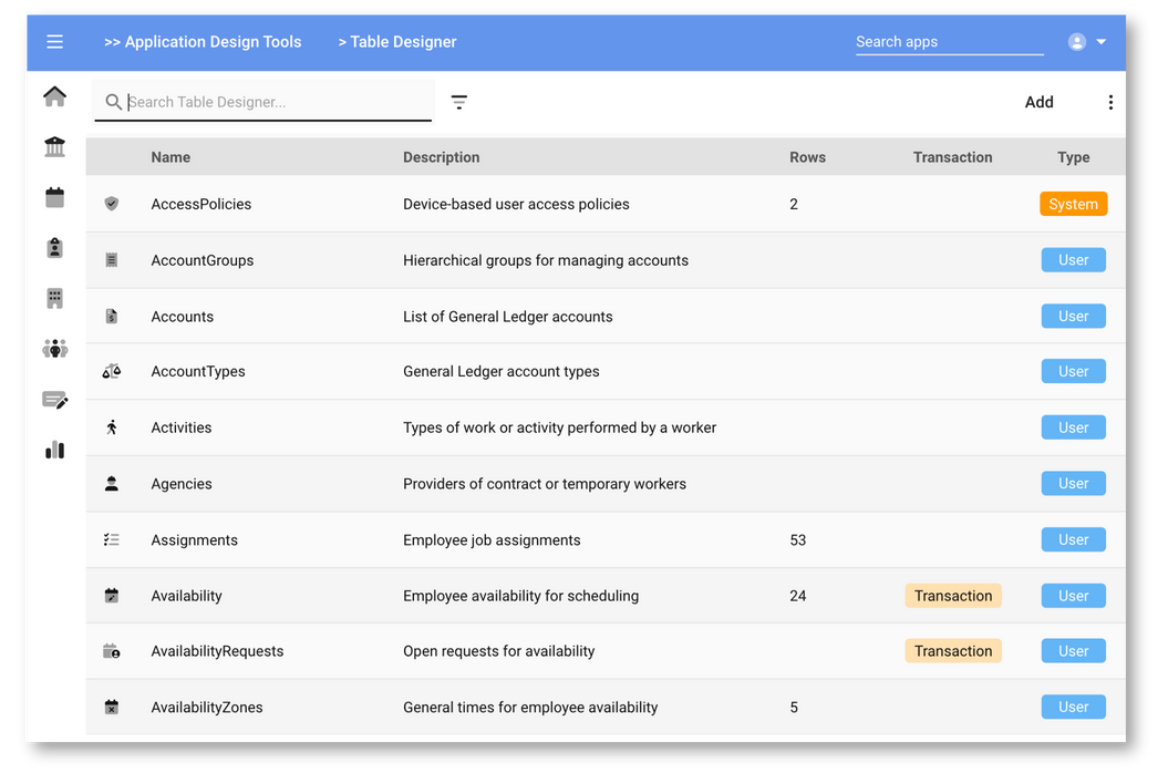 Table Designer. Tables store all of your data in columns and rows, like a spreadsheet. Create fields with data-typing to create more structured access, while still being open to extension.