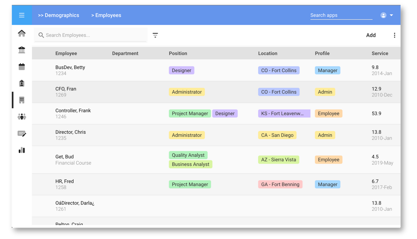 Related demographic data (Locations, Positions, Departments, etc.) are managed in related apps and can be imported from ad-hoc spreadsheets or 3rd party systems.