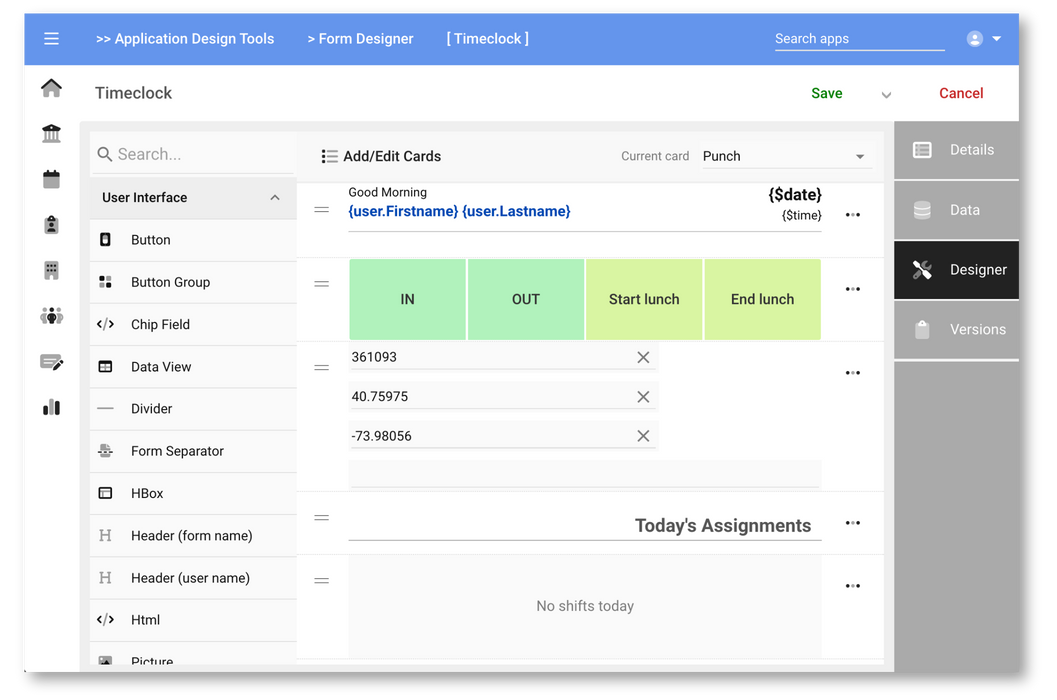 Form Designer. The form designer is the basis of all user presentation. Create forms for clocking, entering leave, expenses, or ad-hoc forms such as job survey, injury or benefit changes.