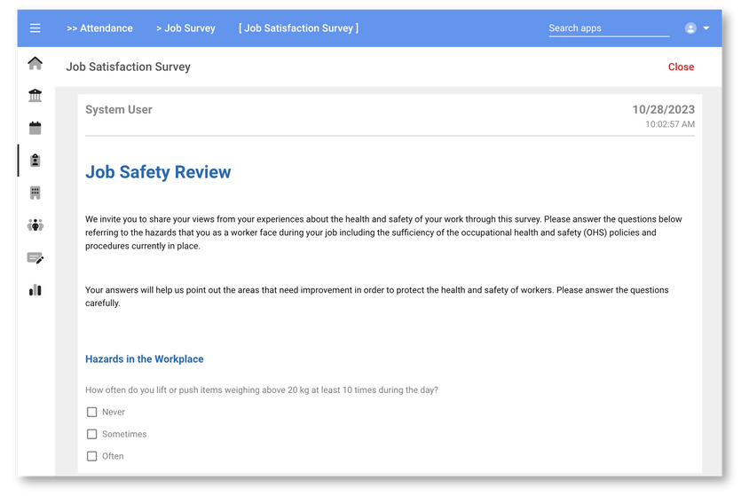 Attestations are available to query for work related info, such as injury, satisfaction survey, or compliance with work policies.
