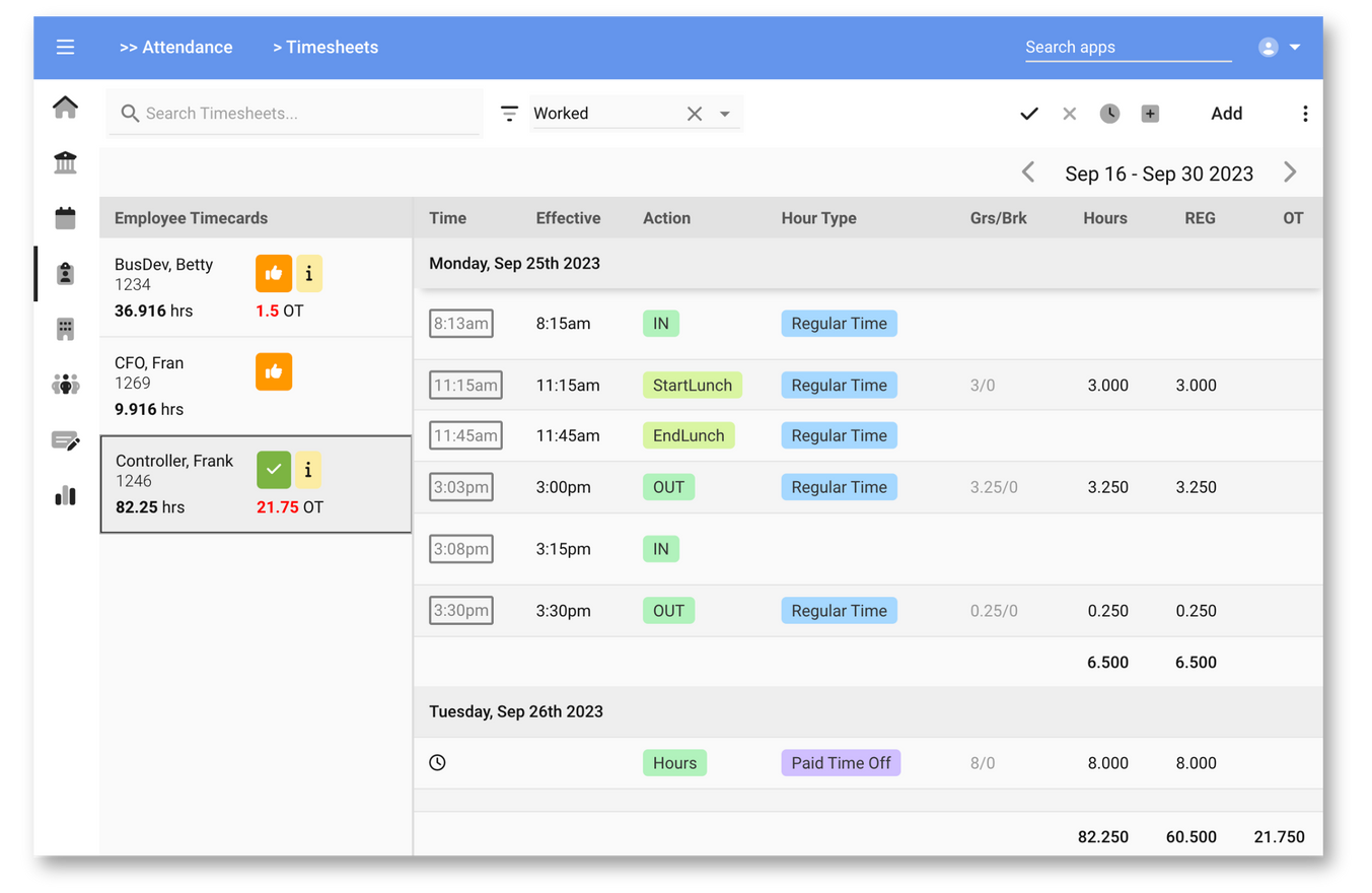 Timesheets. Punch transactions captured on time clocks or mobile devices are processed in real-time by the rules engine, providing both workers and manager with accurate time and pay calculations.